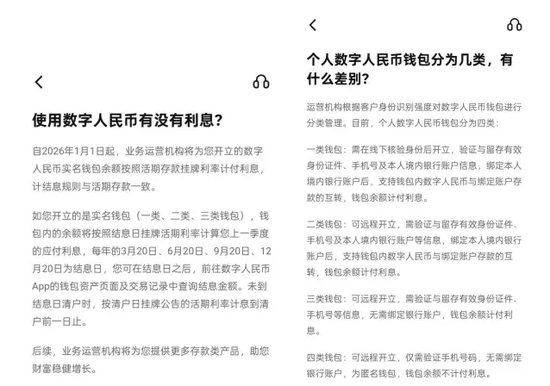 数字人民币App客服进一步说明,如用户开立的是实名钱包(一类、二类、三类钱包),钱包内的余额将按照结息日挂牌活期利率计算上一季度的应付利息,每年的3月20日、6月20日、9月20日、12月20日为结息日。用户可在结息日之后,前往数字人民币App的钱包资产页面及交易记录中查询结息金额。未到结息日清户时,按清户日挂牌公告的活期利率计息到清户前一日止。
