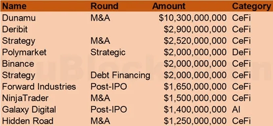 12 月公开的总融资金额为 8.6 亿美元,环比下降 94.1%(2025 年 11 月共 145.4 亿美元)。2025 年全年公开的投资总金额为 497.5 亿美元,同比上升 433.2%(2024 年全年共 93.3 亿美元)。其中,金额排名前 10 的轮次如下(全年):