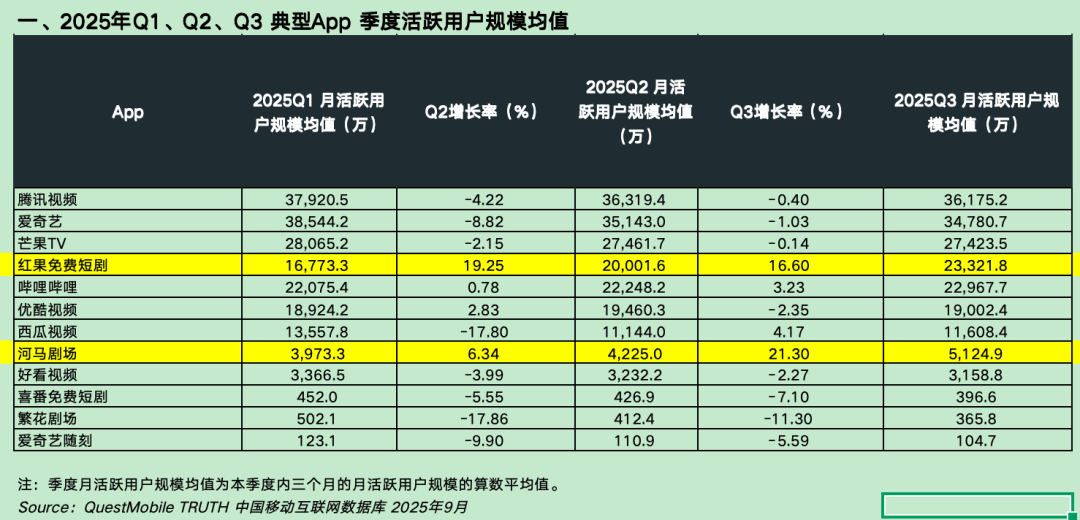 月活用户规模上看,红果短剧从2025年一季度的第六位到三季度增长至第四位,视频领域位列于腾讯视频、爱奇艺、芒果TV之后。