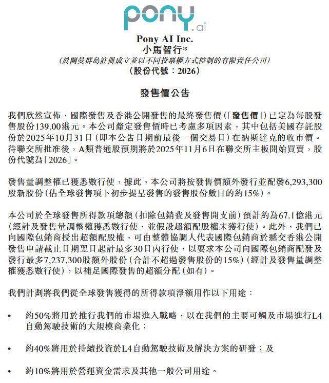 本次所筹资金计划分配如下:约50%用于推行市场进入战略,推进L4自动驾驶技术的大规模商业化;约40%用于L4自动驾驶技术及解决方案的开发;约10%用于营运资金需求及其他一般公司用途。公司股份将于11月6日在香港联交所主板开始买卖。