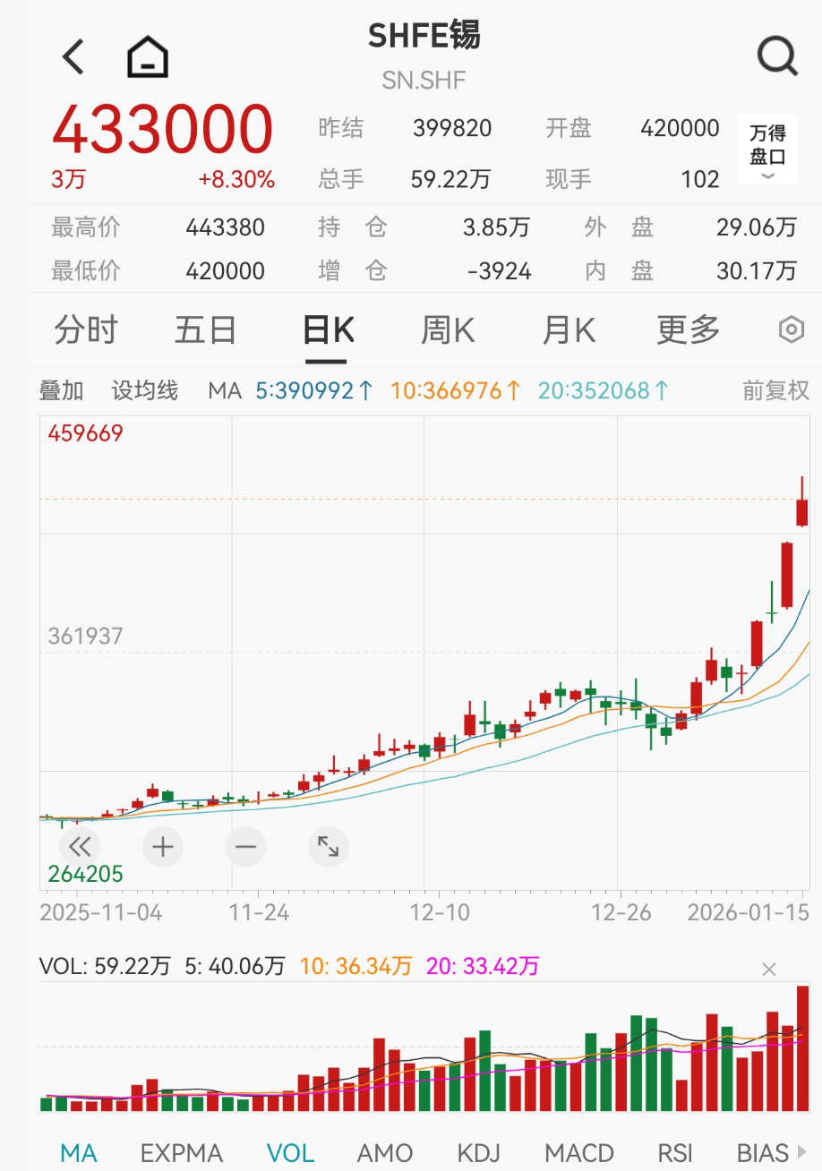 自2026年1月16日(即1月15日夜盘)交易起,非期货公司会员、境外特殊非经纪参与者、客户在锡期货各合约的日内开仓交易的最大数量为800手。实际控制关系账户组日内开仓交易的最大数量按照单个客户执行。套期保值交易和做市交易的开仓数量不受此限制。