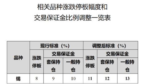 锡期货合约的涨跌停板幅度调整为11%,套保持仓交易保证金比例调整为12%,一般持仓交易保证金比例调整为13%。