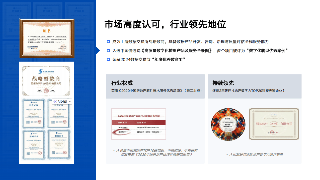 从实践案例与资质来看,盟拓已协助某大型产业园集团完成全国百余项目的招商业务标准化落地与全流程在线管理,实现签约回款主线的闭环管控与数据沉淀,验证了其服务大型集团的能力。公开资料显示,该公司为上海数据交易所战略数商,入选中国信通院《高质量数字化转型产品及服务全景图》,并拥有高新技术企业、江苏省瞪羚企业等资质,技术实力与行业认可度得到权威背书。