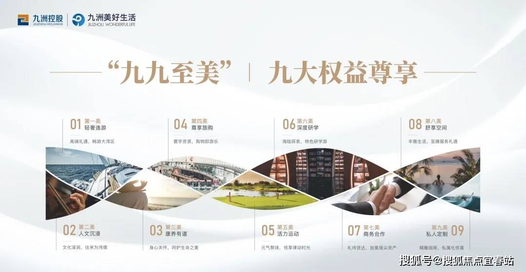 九洲控股集团围绕精英生活打造多种场景和服务,从物质、社交、精神、文化等层面,制定“九九至美”九大尊享权益,给到九美会员全方位体验。