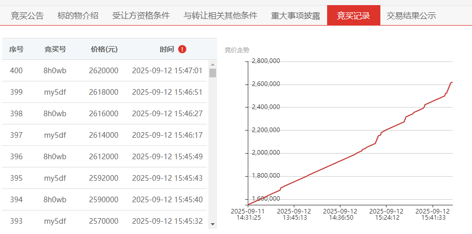 竞价次数最多案例:内蒙古产权交易中心有限责任公司挂牌的厂区钢结构顶棚及其他金属设备整体打包转让项目,挂牌价60万元。项目上线后引发市场热烈关注,浏览量突破4400次,吸引13人报名参与。经过1047轮激烈竞价,最终以138万元成交,增值78万元,增值率达130%,充分体现了平台市场化竞价机制对资产价值的深度挖掘能力。