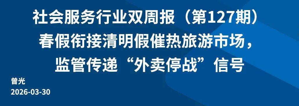 行业与公司动态:春假衔接清明假“小黄金周”临近,旅游市场火热。飞猪数据显示,景区门票及酒店预订量同比大幅增长,赏花踏青主题火热,上海、北京等传统目的地与澳门、西藏等长线游受青睐,海南文昌、新疆博尔塔拉等小众目的地预订增速超100%,出境游当地玩乐消费也显著提升。此外,也有越来越多的省份开始探索春秋假,报告期内如湖南省教育厅探索在中小学增设春秋假,有望进一步释放家庭亲子出游需求。市场监管总局传递叫停外卖平台补贴大战信号,并发布新规强化网络餐饮安全主体责任。两办印发文件,计划用3年左右基本建立覆盖全民的长期护理保险制度,为养老护理产业开辟长期空间。麦当劳中国在部分城市限时上线蛋挞产品,加码下午茶场景;飞猪发布首个全品类旅行SKILL,提升服务生态开放性。岭南控股拟投资设立子公司,强化“东方宾馆”品牌运营;豆神教育董事长变更,意图聚焦AI与教学教研创新。