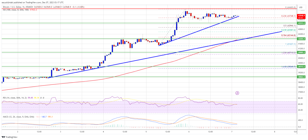 比特币价格开始大幅上涨,突破 42,000 美元阻力区。 BTC飙升,甚至突破了43,200美元的阻力区。在价格开始小幅下行修正之前,在 44,465 美元附近形成了新的数月高点。