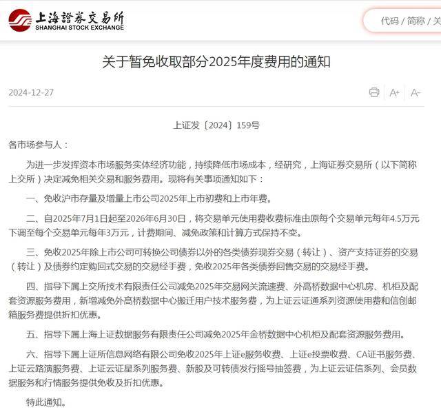 六、指导下属上证所信息网络有限公司免收2025年上证e服务收费、上证e投票收费、CA证书服务费、上证云路演服务费、上证云证星系列服务费、新股及可转债发行摇号抽签费,为上证云证信系列、会员数据服务和行情服务提供免收及折扣优惠。