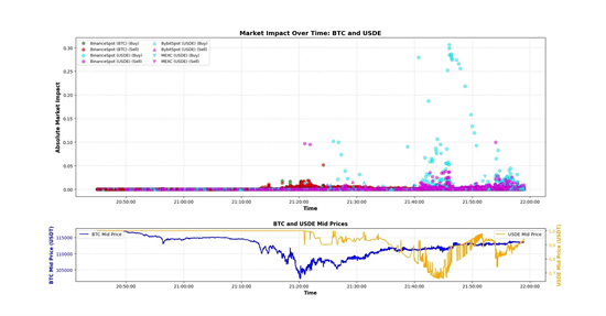 关于Ethena的USDe更是如此。数据显示,这个合成美元在Curve等主要流动性池始终保持稳定,偏离不超过0.3%。在币安上的异常价格出现在市场已经见底之后——当比特币在21:20触底时,USDe在大部分平台仍接近1美元。