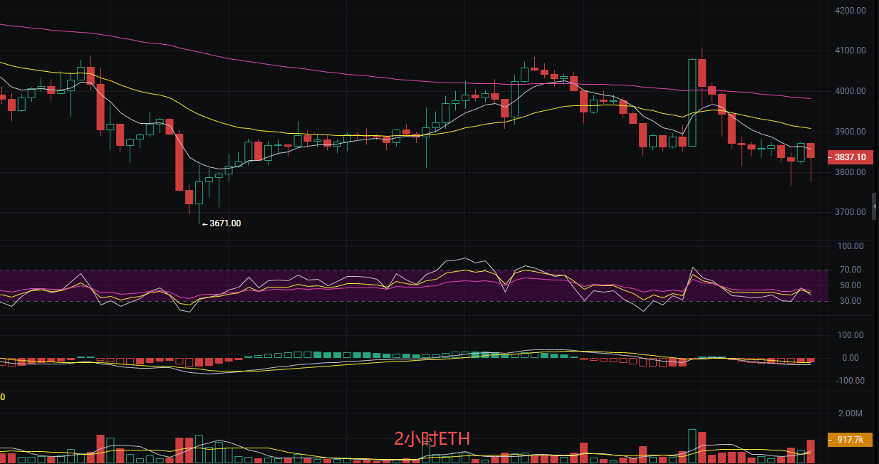 发稿前以太坊现价3837,丽盈观察目前盘口以太坊下跌趋势空头占据主导地位。近期K线形成看跌吞没形态,结合均线系统的空头排列,进一步确认了市场的下行压力。价格接近关键支撑位3671,若该支撑失守,可能引发更深的下跌,日线处于震荡下行趋势且高点逐步降低。2小时形成多个小幅反弹后回落的形态,整体呈现弱势调整。MACD2小时动能偏空。EMA短期、中期、长期均线均对价格构成压力,由此可见上方有连续压力,所以趋势上可以在上方寻找压力位以后空为主,短线多丽盈不建议持有时间太久,安全第一